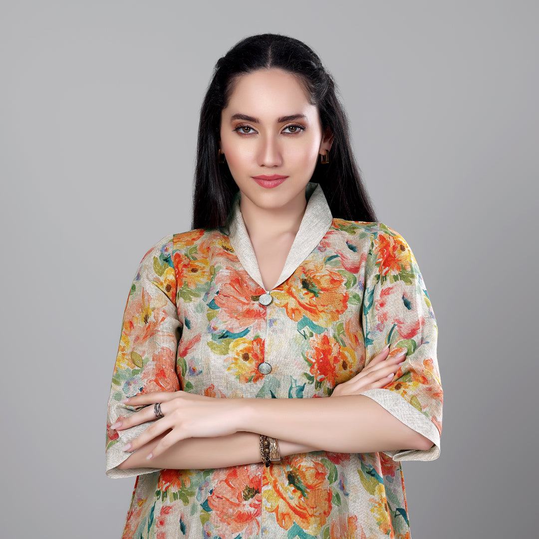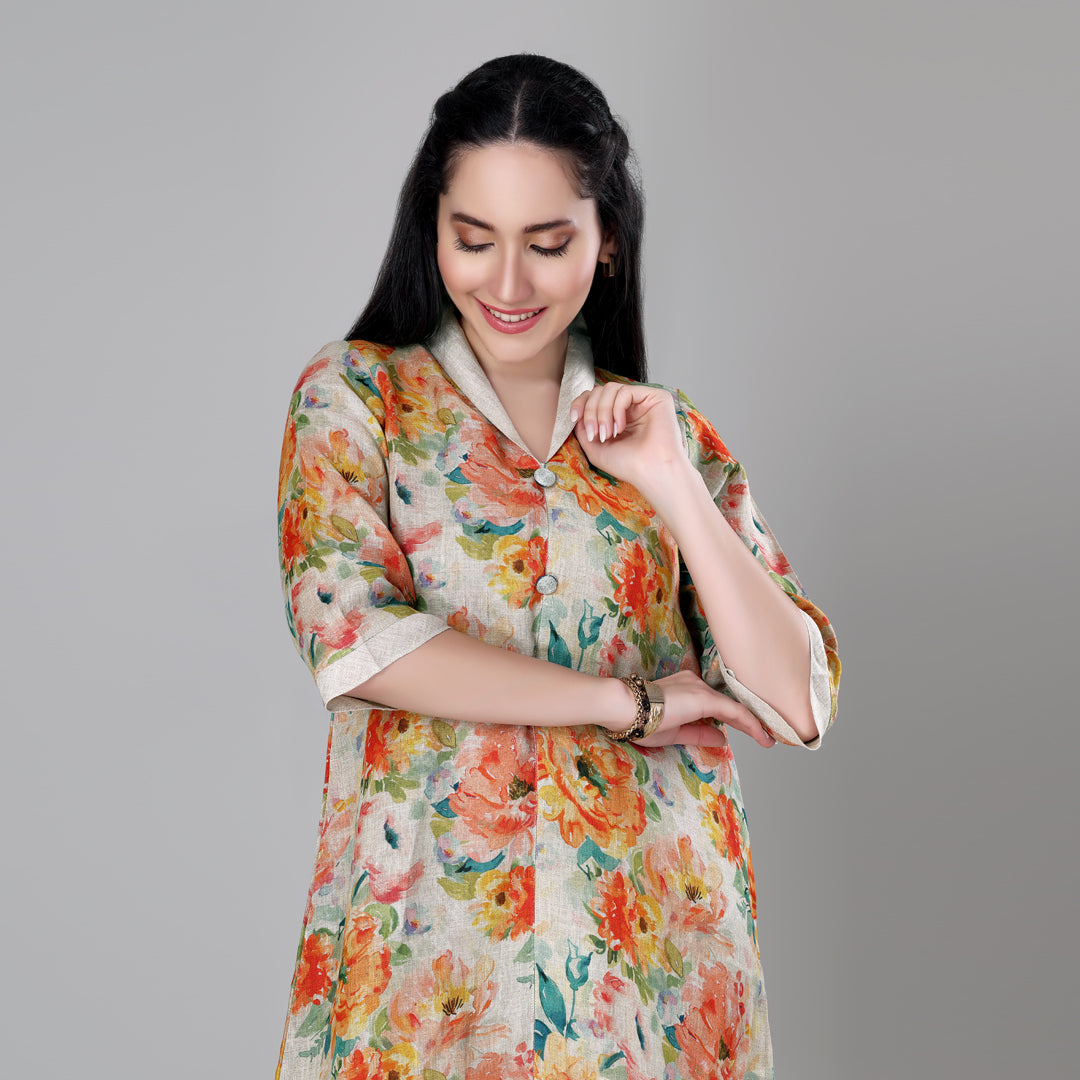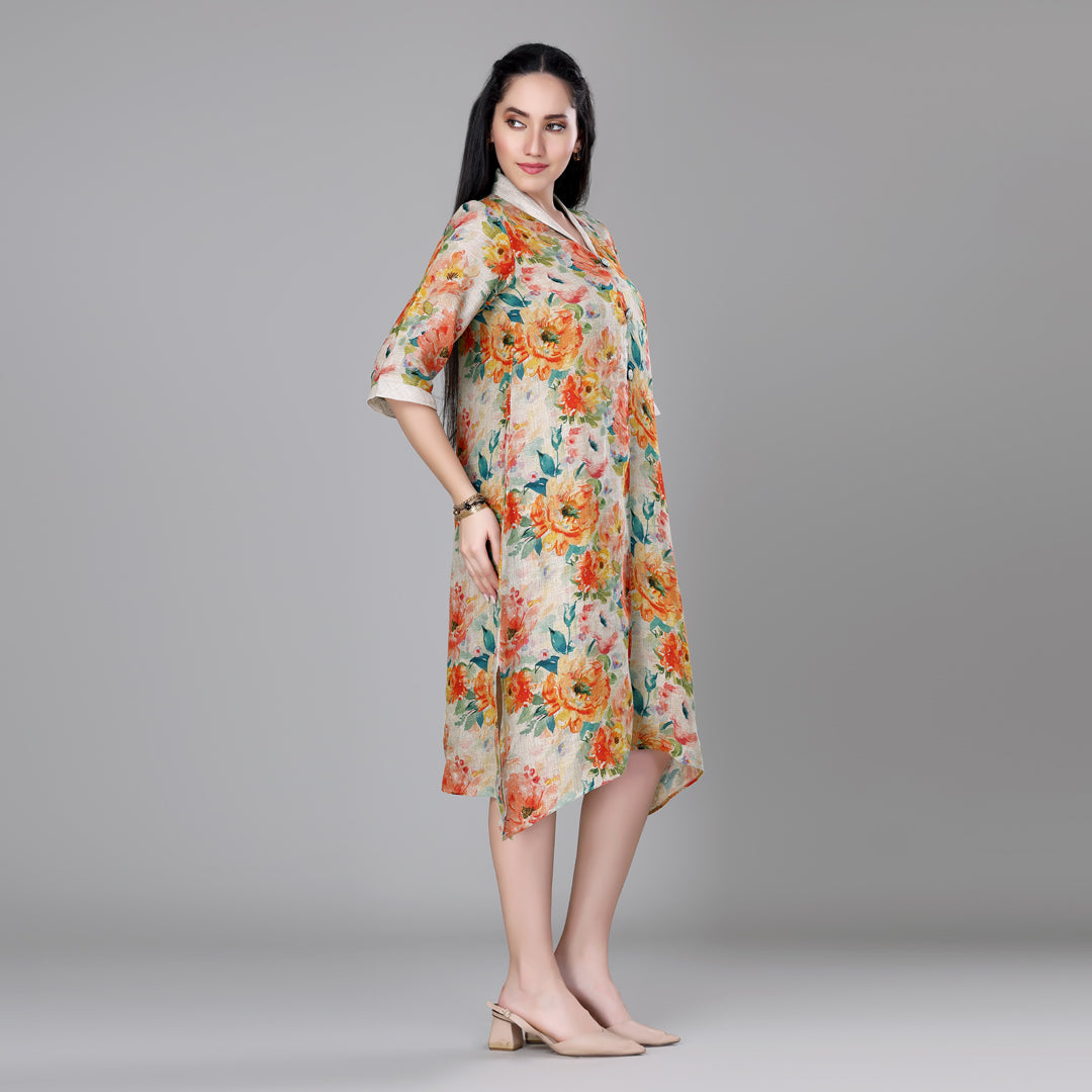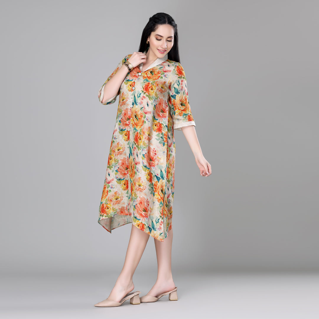 Design: Cuban collar floral printed dress with asymmetric hem