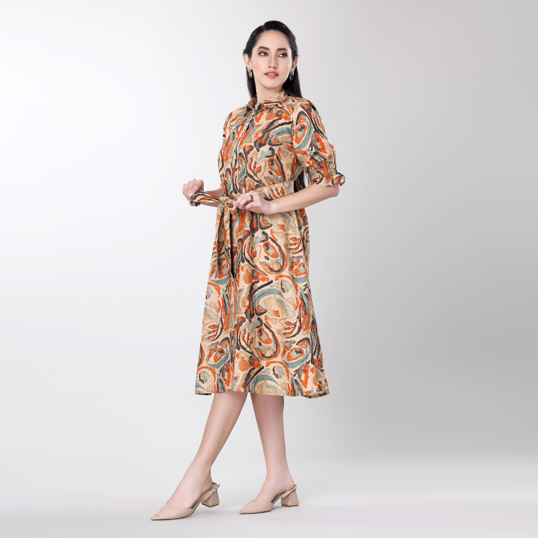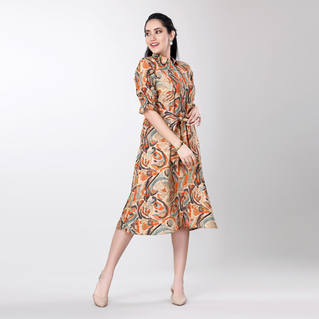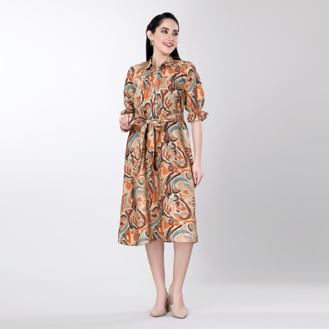 Design: Belted collared button down shirtdress with all over abstract print and belt detail