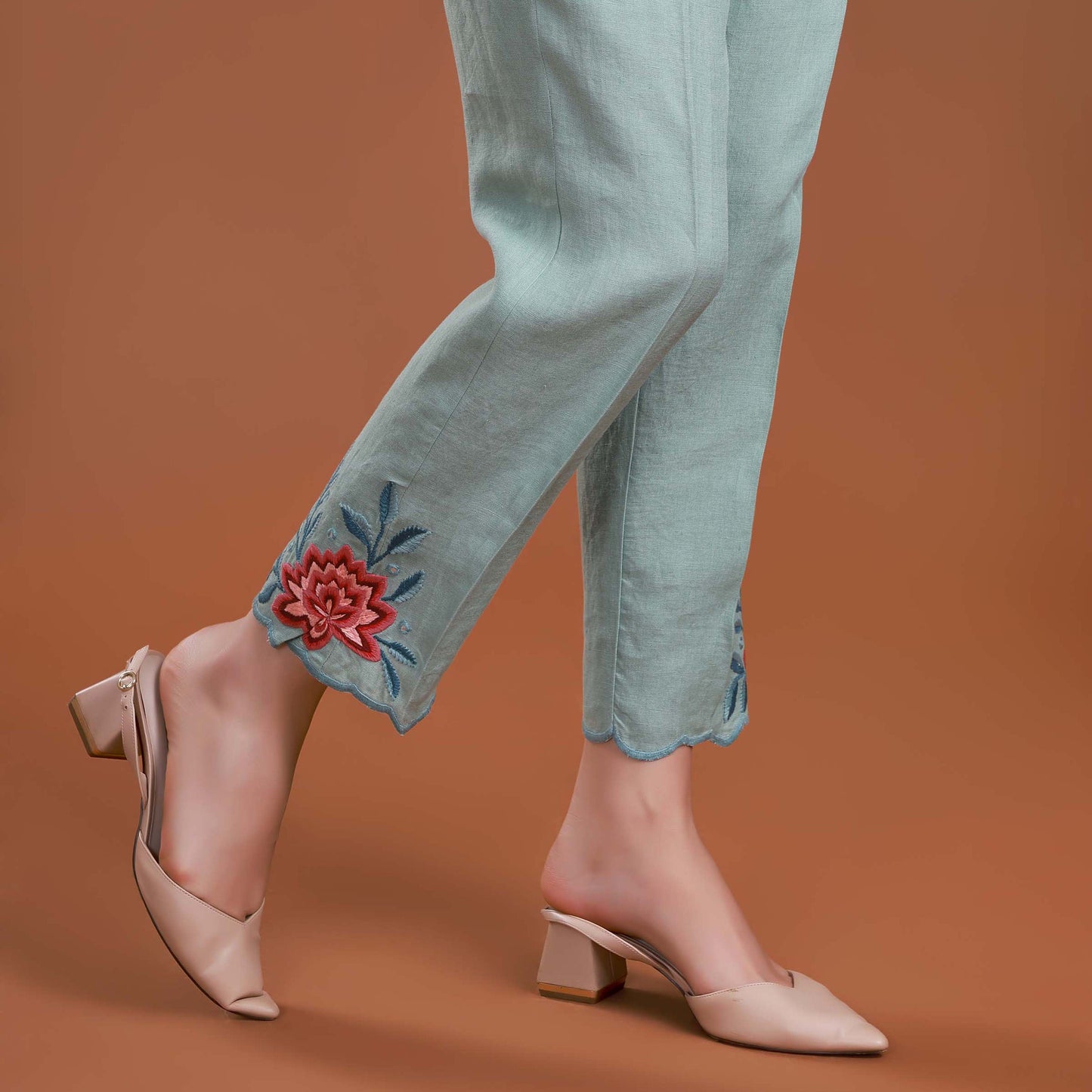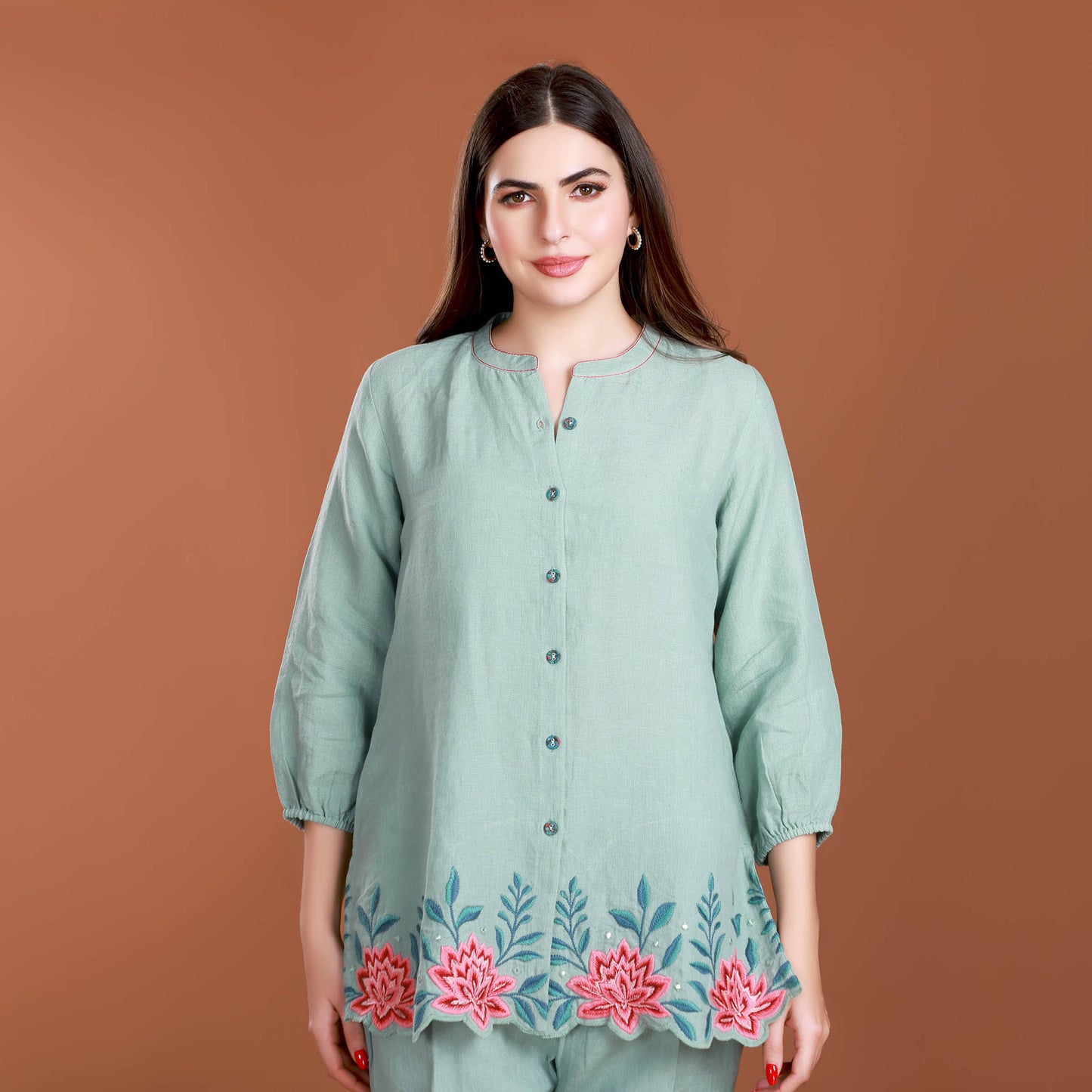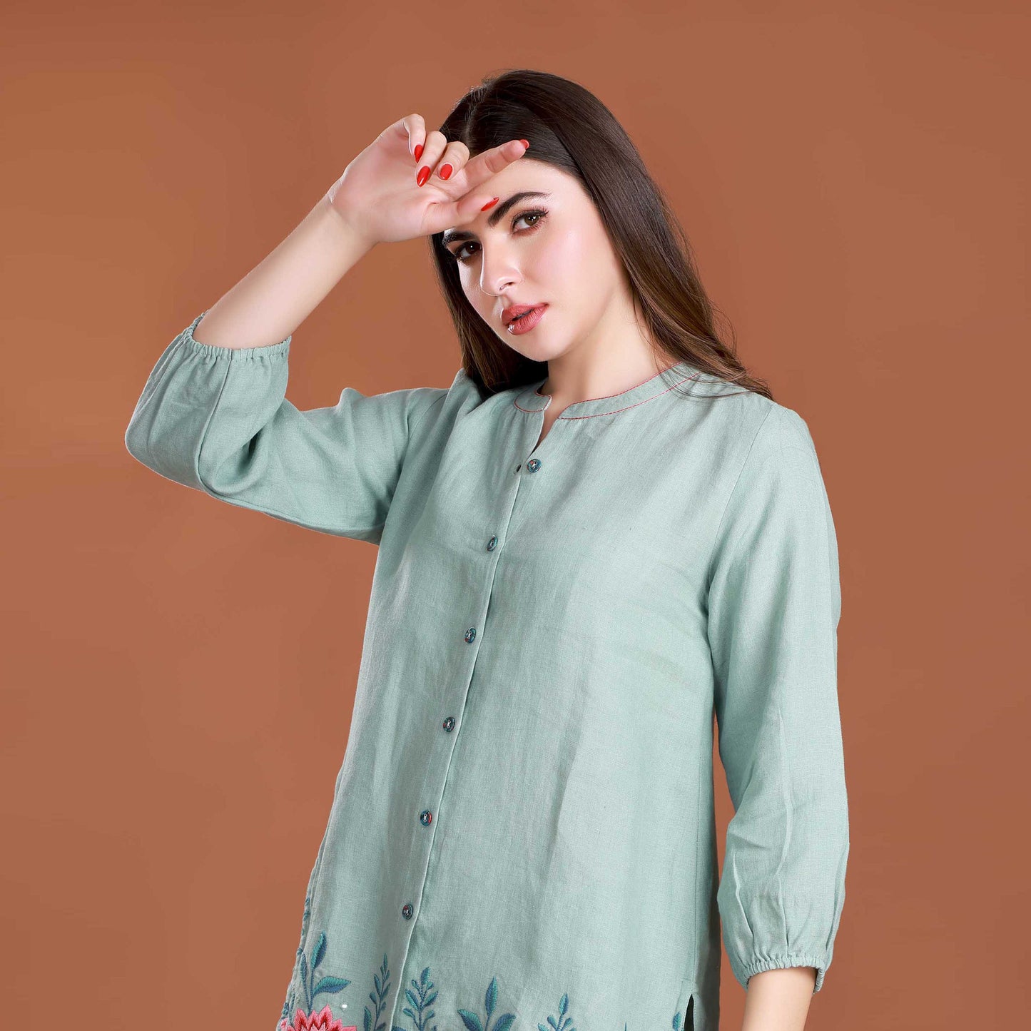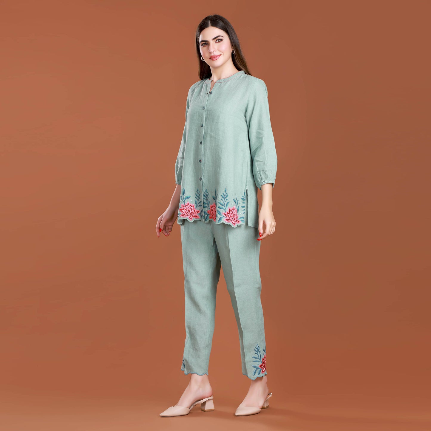 Design: Mint colour chinese collar shirt with floral embroidery and cutwork detailing at the bottom coupled with matching colour pants with floral motif embroidery and scallops at the bottom.