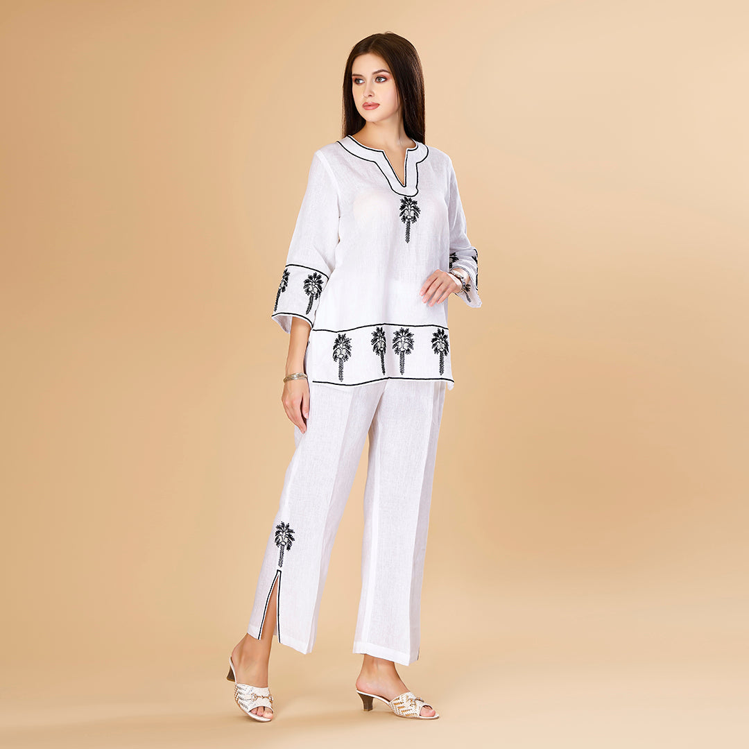 Design: All over embroidery detail short tunic with slit detail straight pants