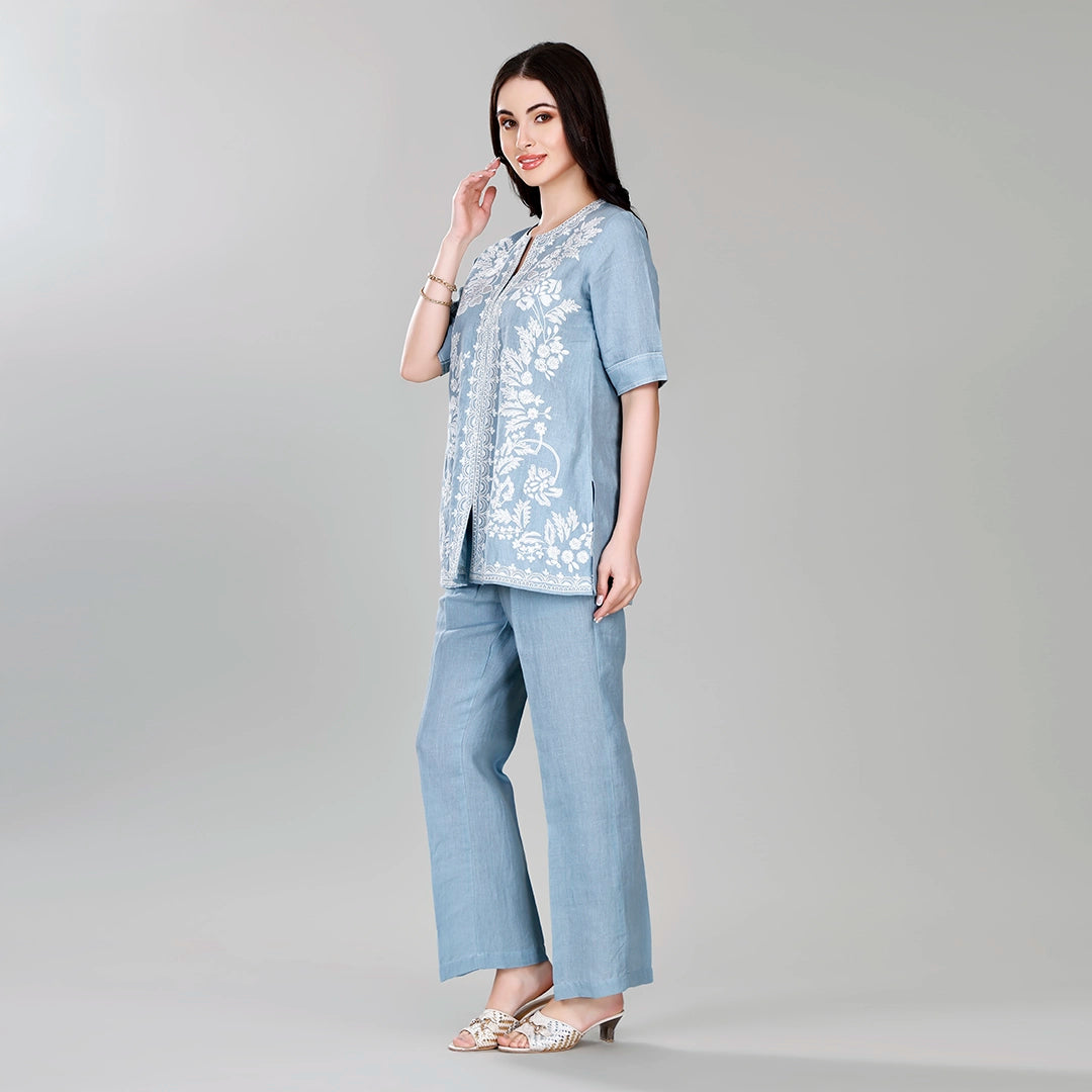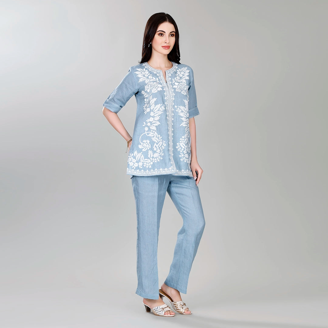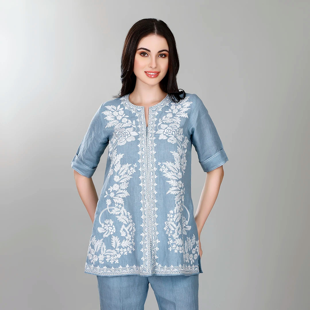Design: Embroidered tunic with quarter sleeves and straight pants