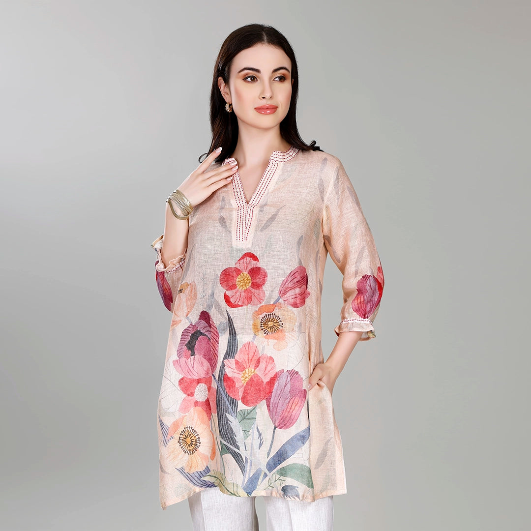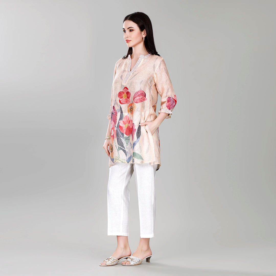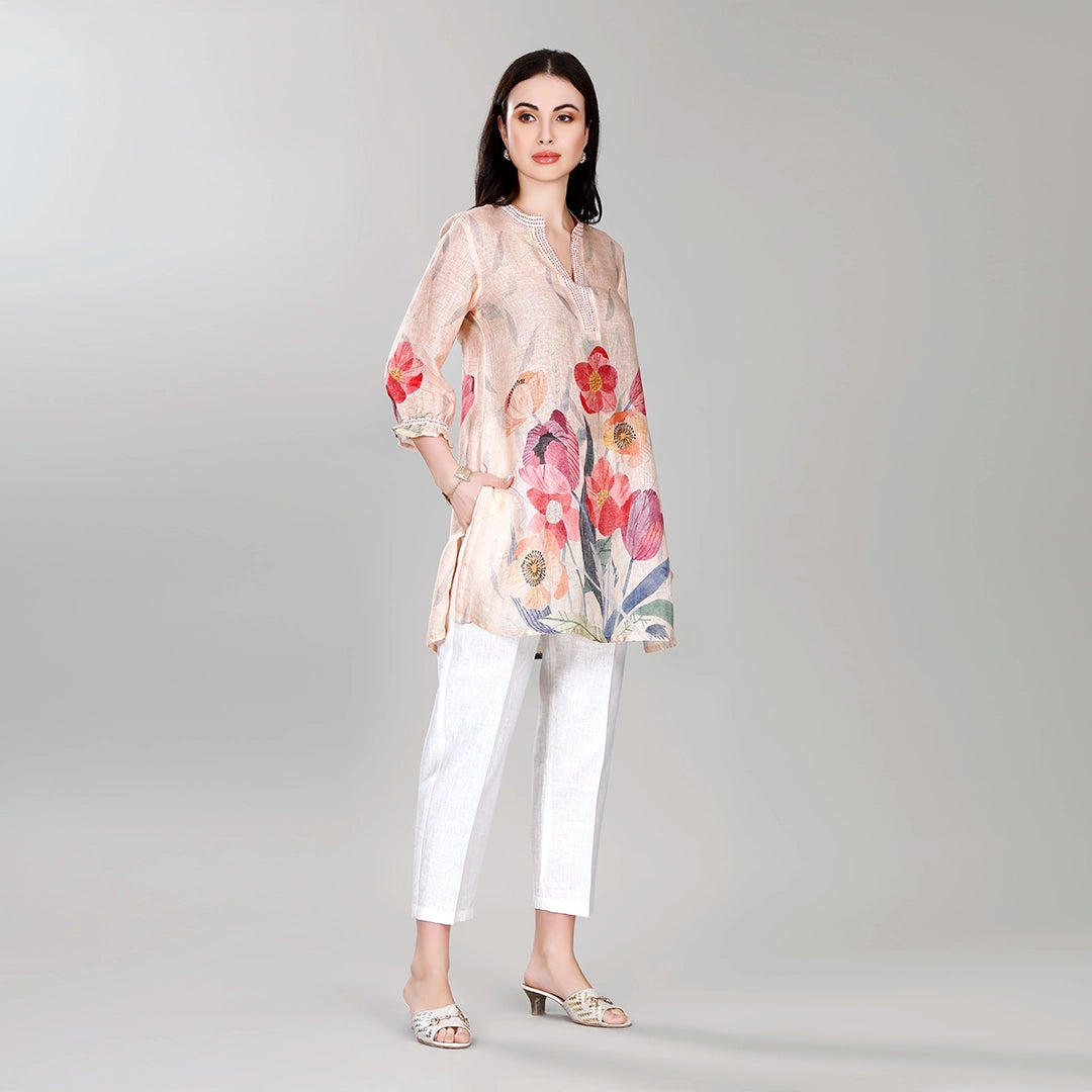 Design: All over floral printed v-neck short tunic with straight trousers