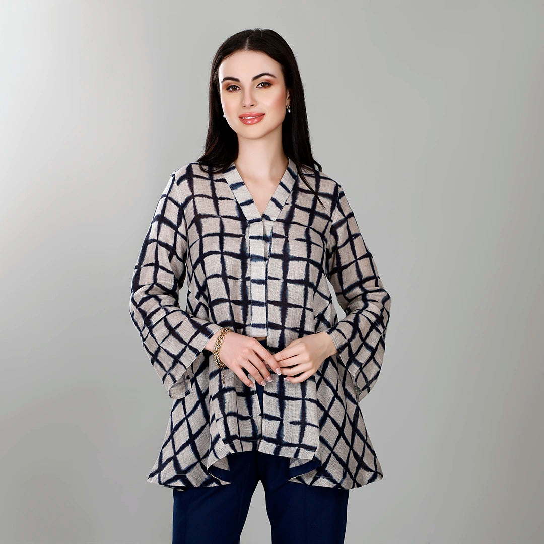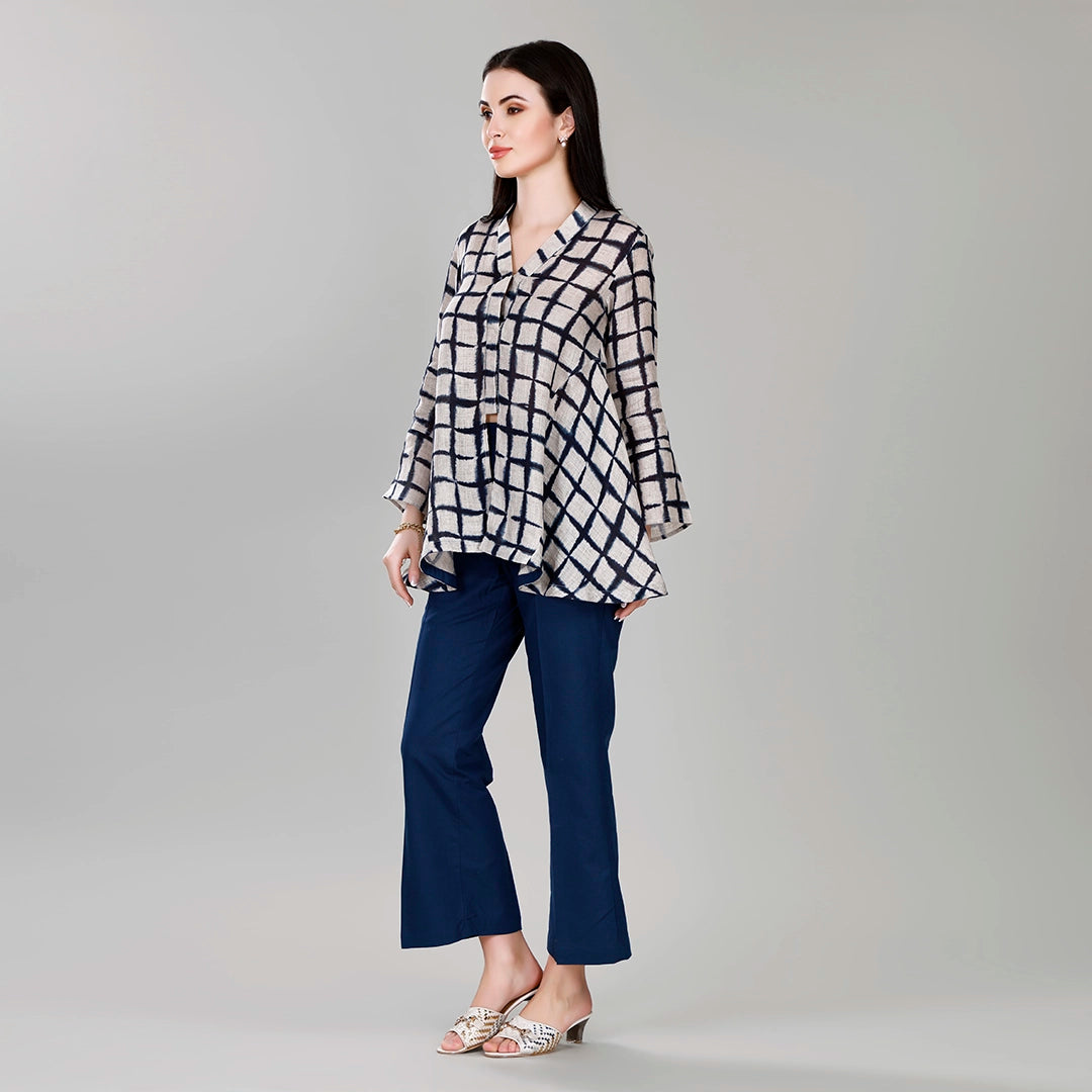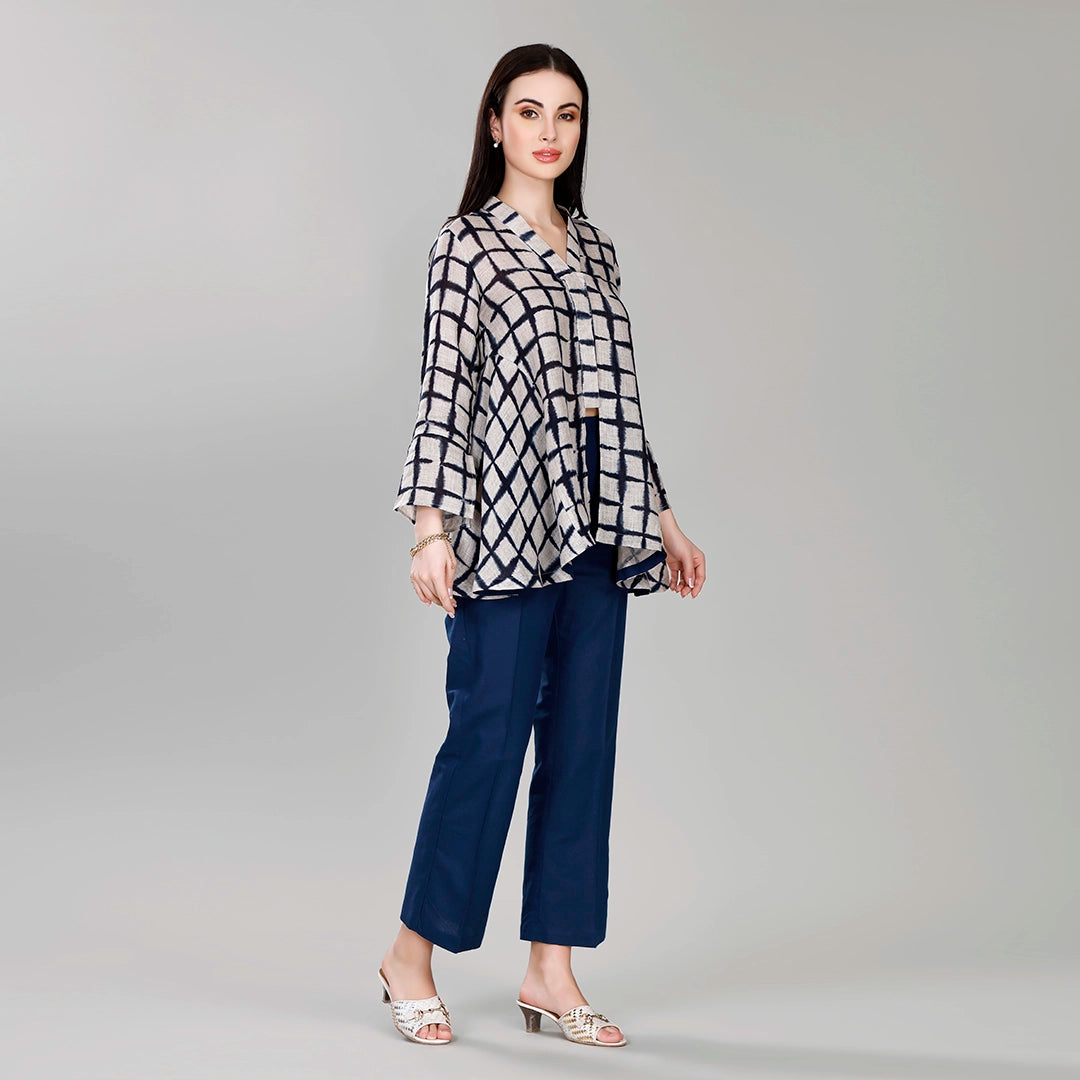 Design: Tie dye inspired printed half placket high low tunic paired with straight trousers