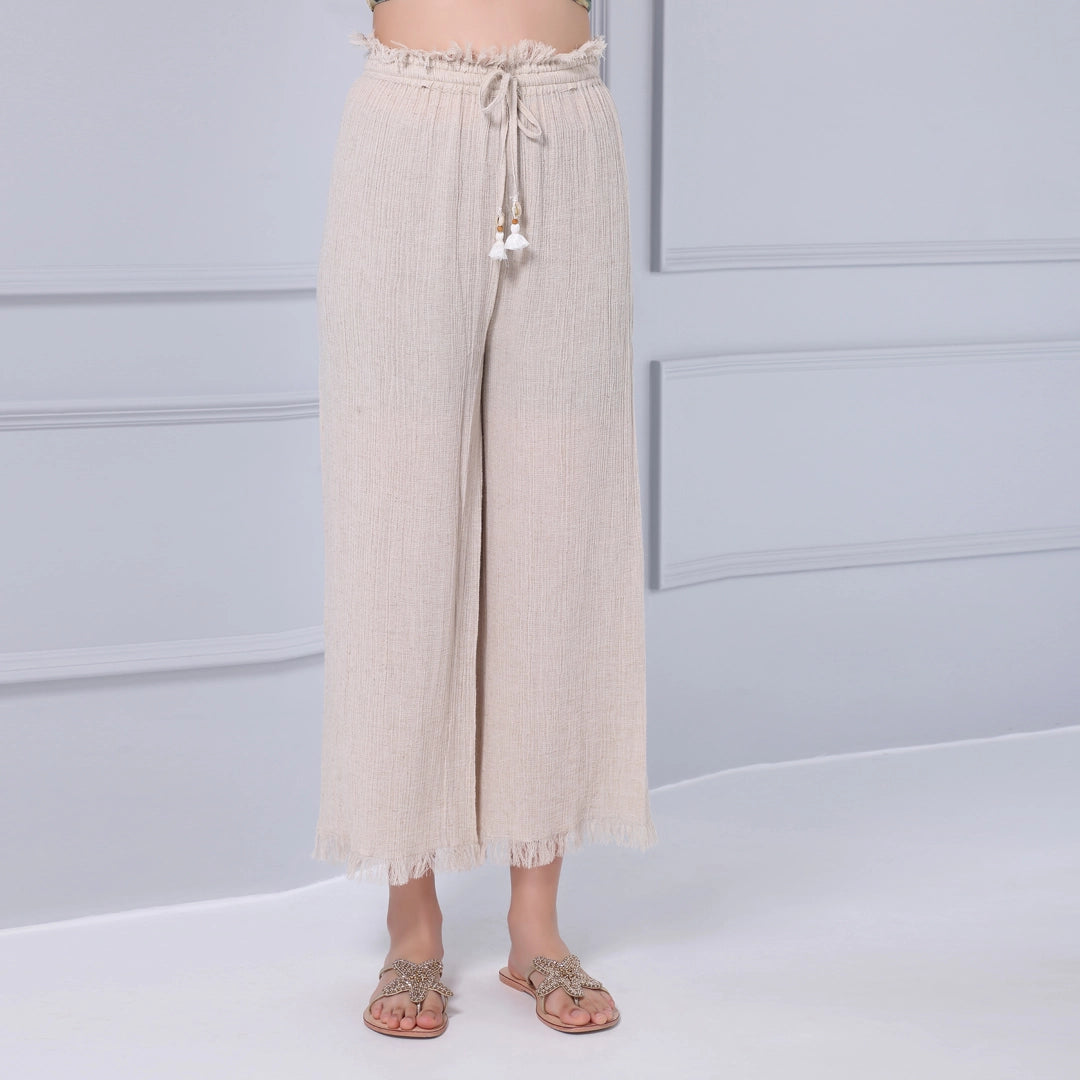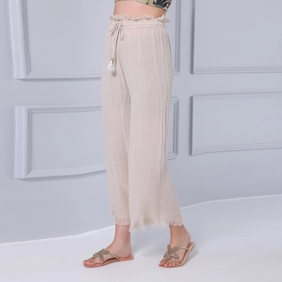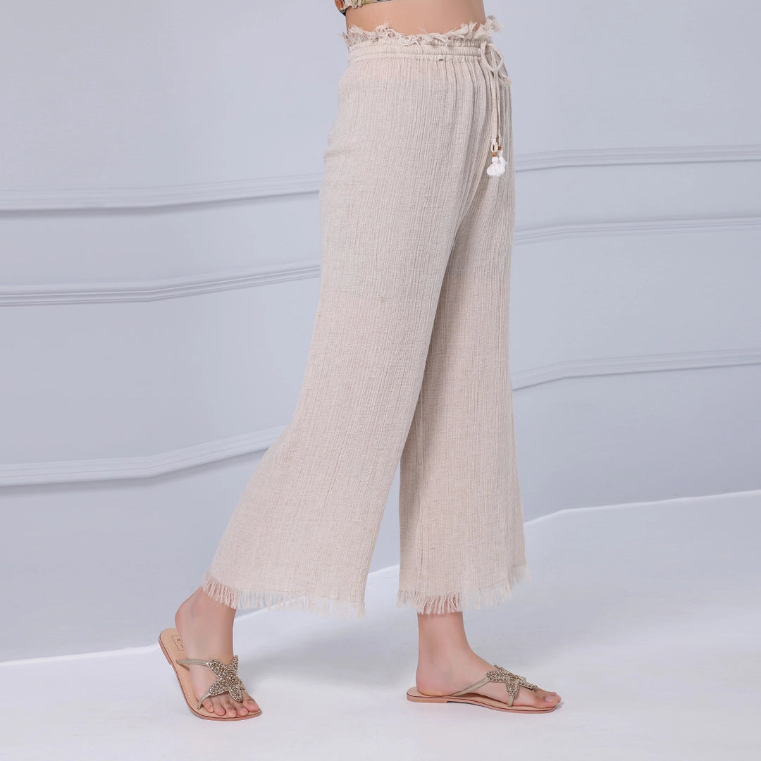 Natural colour crush fabric trouser with frey detailing at the bottom and waist band