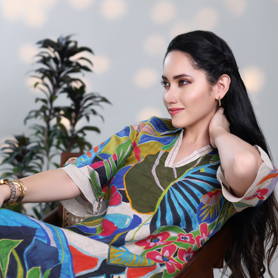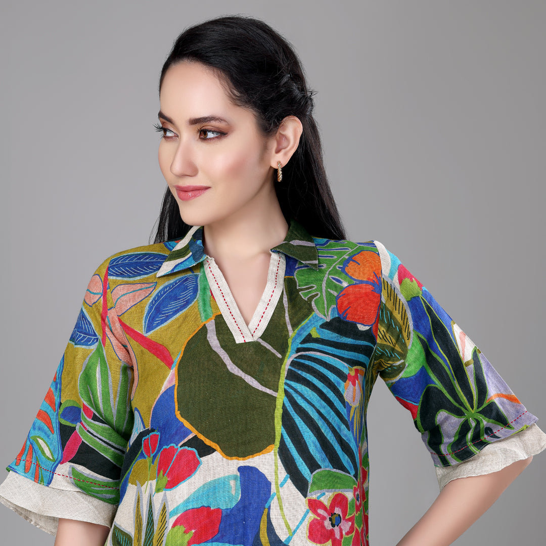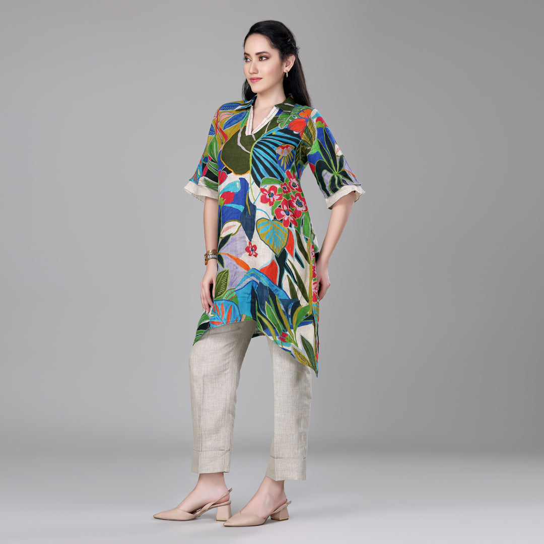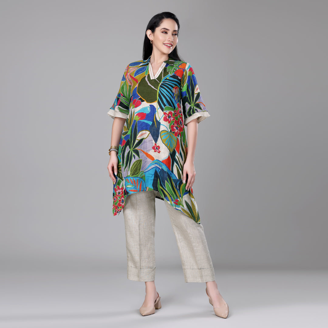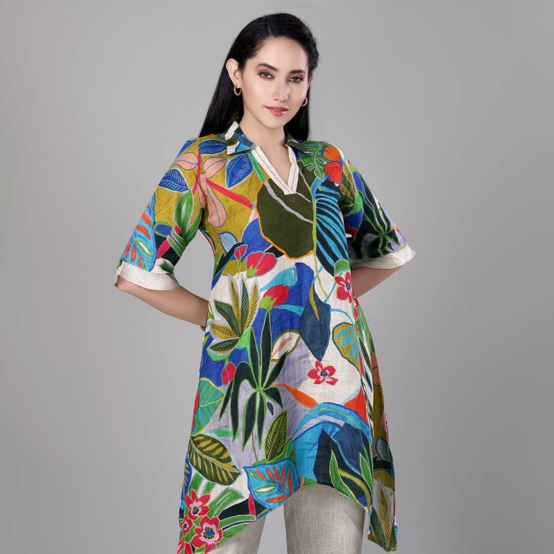 Design: Digitally printed v-neck tropical tunic with asymmetrical hem