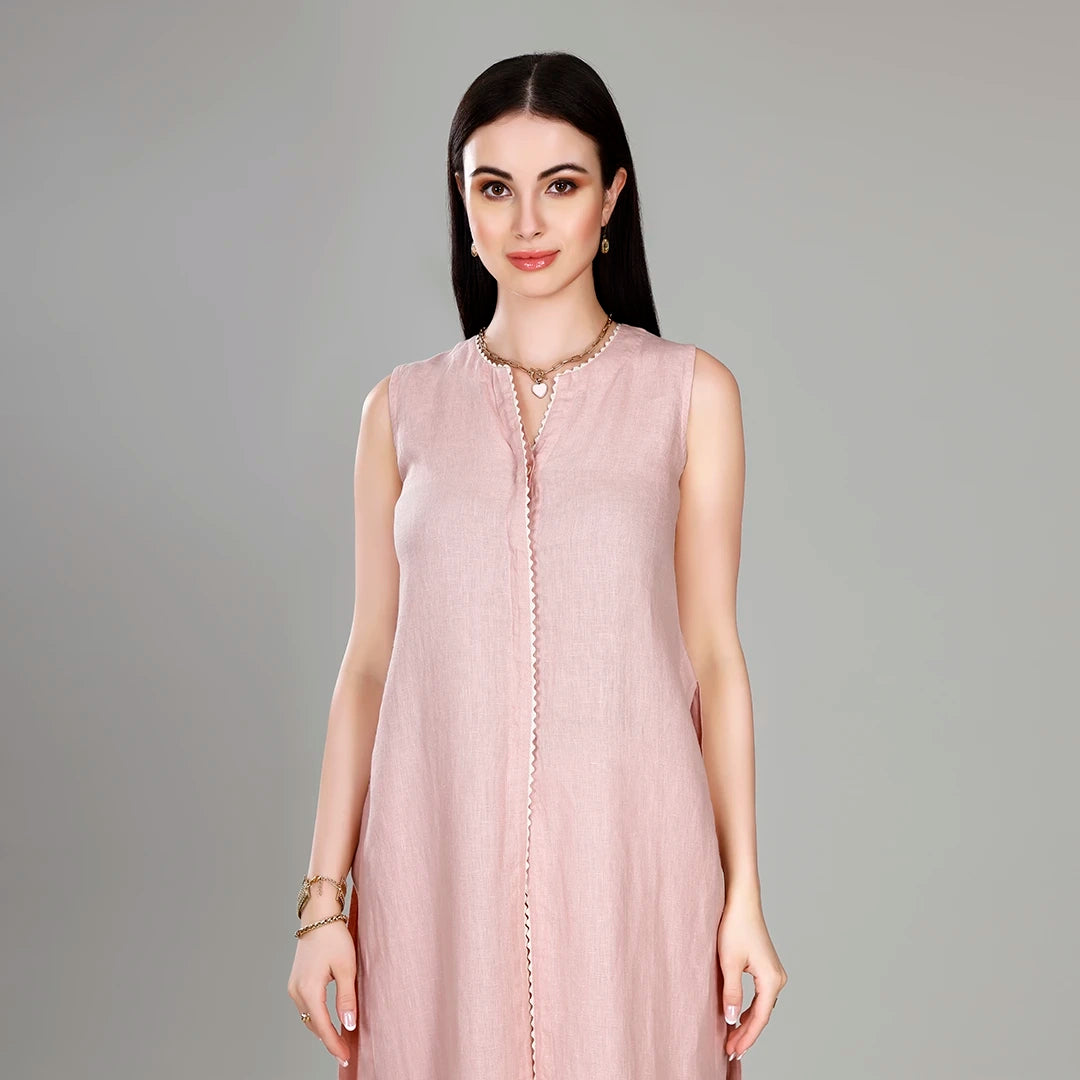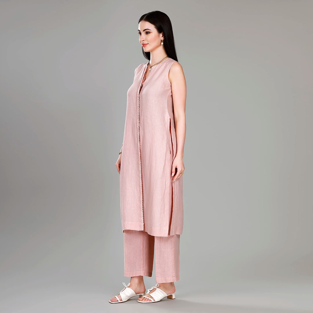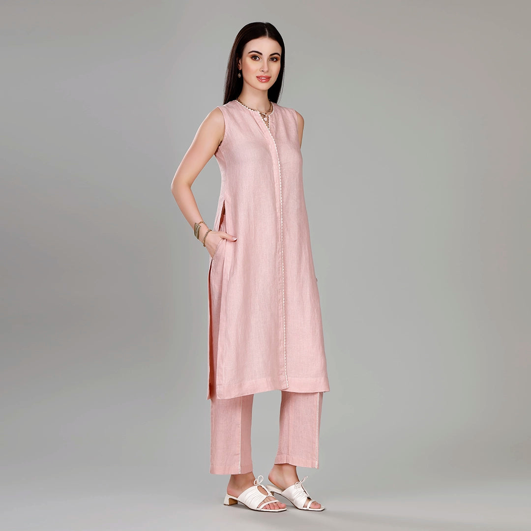 Design: V neck front panel tunic with lace detail, paired with straight trousers